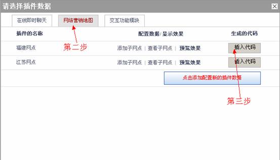 1.在要添加营销地图的代码输入窗口内:.→选择“内容插件” →“网络营销地图” →“插入代码” →“完成”。
