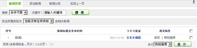 3.在“在新闻列表”,设置新闻的SEO配置(详细【3.4.1】章节进行介绍)、修改、是否推荐,删除等操作。