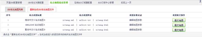 对网站地图进行修改配置,点击“提交地图”,可以将网站地图提交到(页面SEO优化对象中配置中的搜索引擎列表)对应的搜索引擎,以便搜索引擎搜入网站页面。